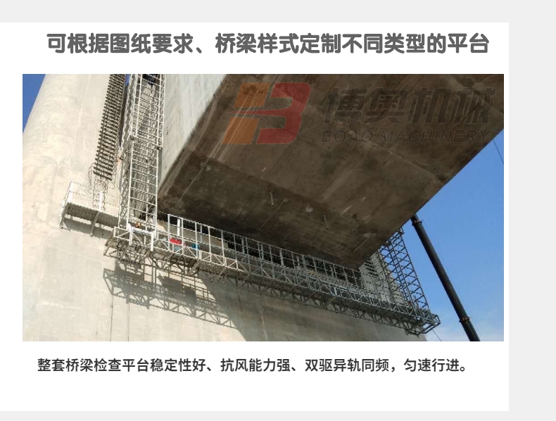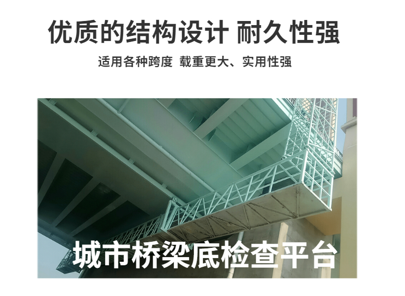 橋底檢查(cha)車采用行(hang)走機構通(tong)過特制咬(yǎo)合鋼輪倒(dao)置于熱浸(jìn)鋅處理的(de)工字鋼軌(guǐ)道上,檢查(cha)車車架與(yu)行走🔞機構(gou)相連,在變(bian)🤩頻電機的(de)驅動下行(háng)走。檢查車(che)車架主要(yào)由方形鋼(gang)管制成的(de)框架式栓(shuan)焊結構,是(shi)檢修橋梁(liáng)時用于載(zǎi)人和放置(zhi)工具、材料(liào)的平台,整(zhěng)🎯車可在軌(gui)道上沿橋(qiáo)梁縱👣向行(háng)走。整個車(chē)架爲可拆(chai)卸式結構(gou)。