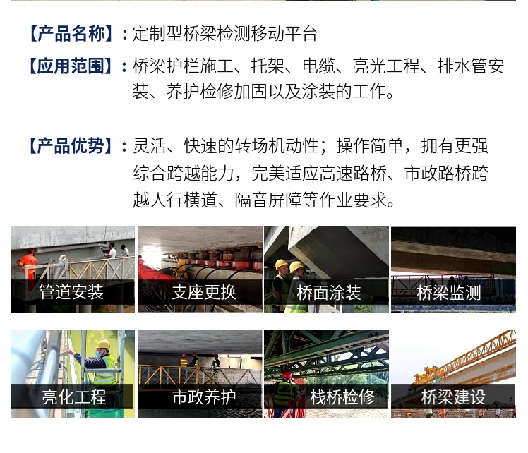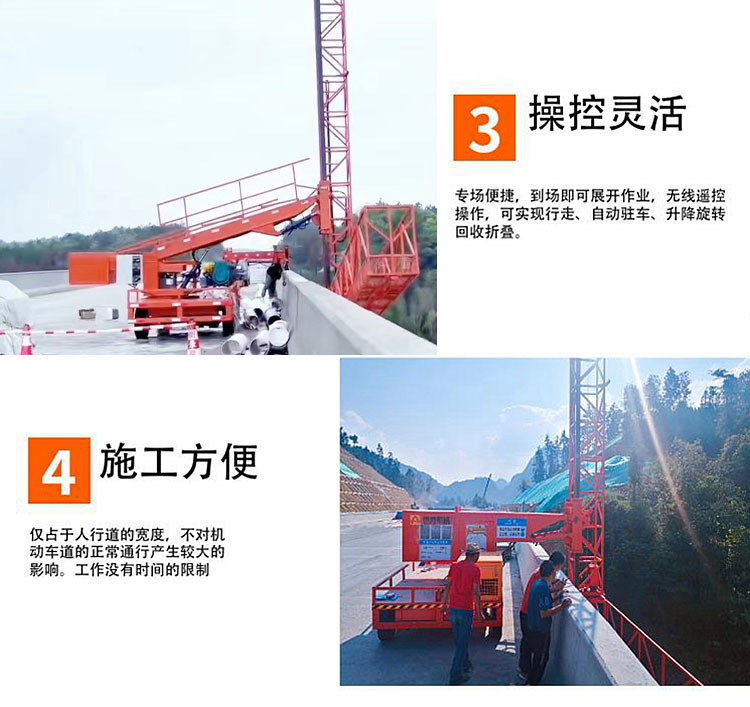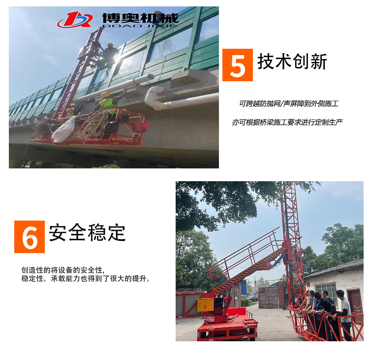 它(tā)可的優(yōu)勢是可(ke)以跨越(yue)人行道(dào)、防抛網(wang)、聲屏障(zhang)等障礙(ai)物伸到(dao)橋梁側(cè)面施工(gōng)。