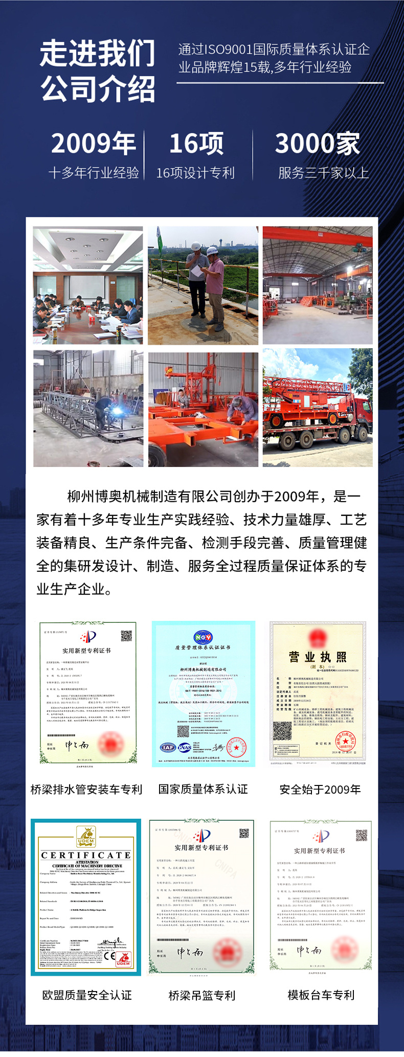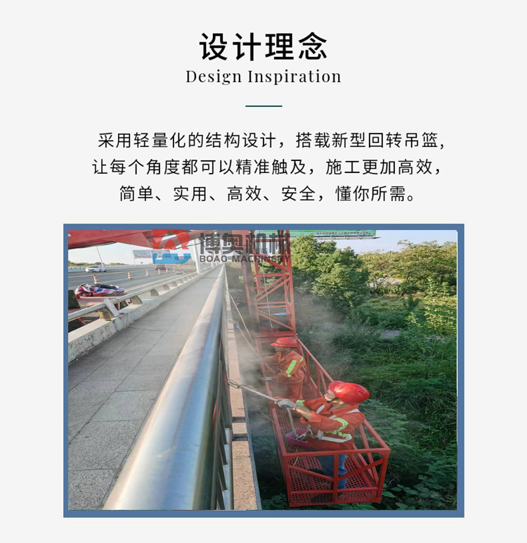 橋梁落水管(guan)安裝施工設備(bei)設置有配重平(ping)台,通過配重平(ping)台保持整個裝(zhuang)置的平衡,确保(bao)施工安全,台車(chē)系統整體平穩(wěn)靈活移動,并裝(zhuāng)備了智能電路(lu)控制系統,能夠(gou)實現靈活的操(cao)控和全方位安(an)全限制🛀🏻和保護(hu),加強台車整體(tǐ)穩定性。轉移靈(ling)活、效率高,且經(jīng)濟适用、成本低(dī),施工安全性高(gao)。